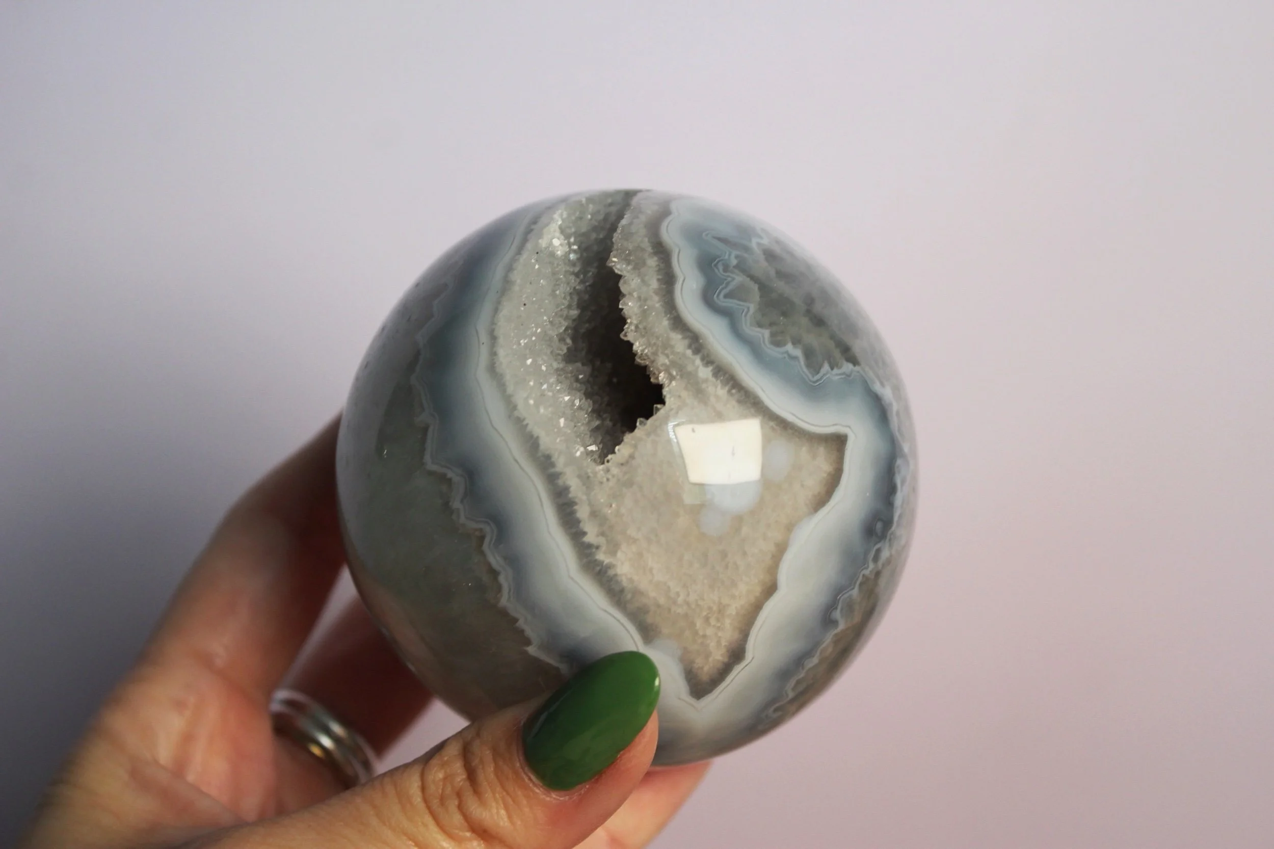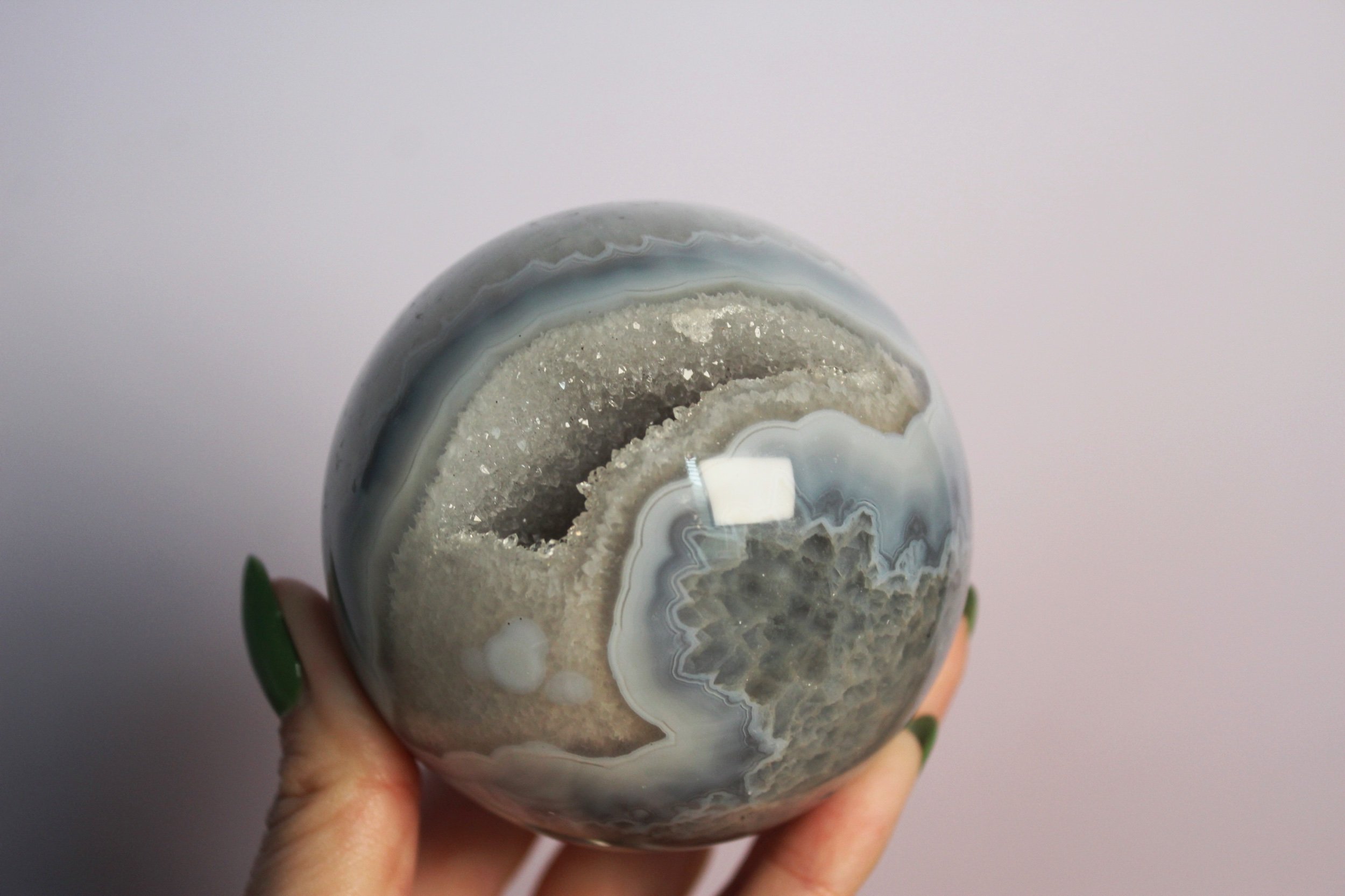 This stunning large druzy agate sphere features a cool, icy blue tone with sparkling crystal pockets throughout. Its natural druzy texture catches the light beautifully, creating a soft shimmer that shifts with every angle. Hand‑selected for its color and clarity, this piece brings a calming, wintery energy and makes a striking addition to any collection.